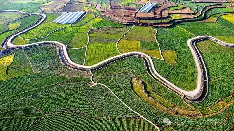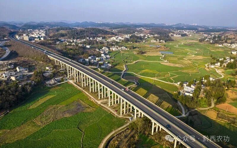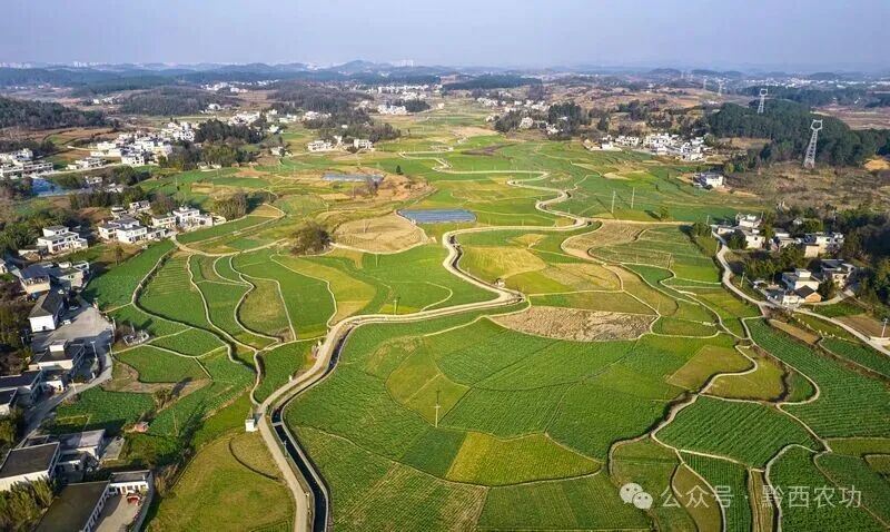 冬日时节,俯瞰贵州省毕节市黔西市金碧镇铧口寨社区,种植油菜的高标准农田与整洁村庄、高速公路交相辉映,构成一幅绿意盎然的美丽乡村画卷。近年来,当地把实施高标准农田项目作为推进美丽乡村建设的重要抓手,不断