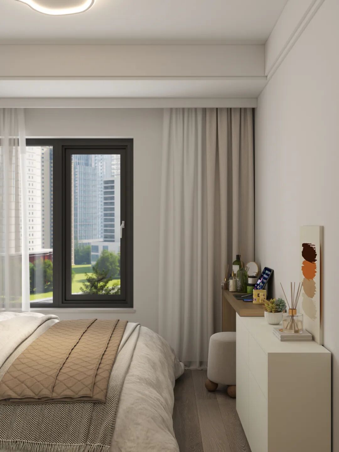 🔶柜体:侘寂风原木/柜门:奶茶白🔶飘窗延伸书桌,深度60向外延伸30公分书桌做玻璃书柜+抽屉,满足收纳功能🔶衣柜开放格+L转角床头柜一体这样的布局设计也可以作为儿童房