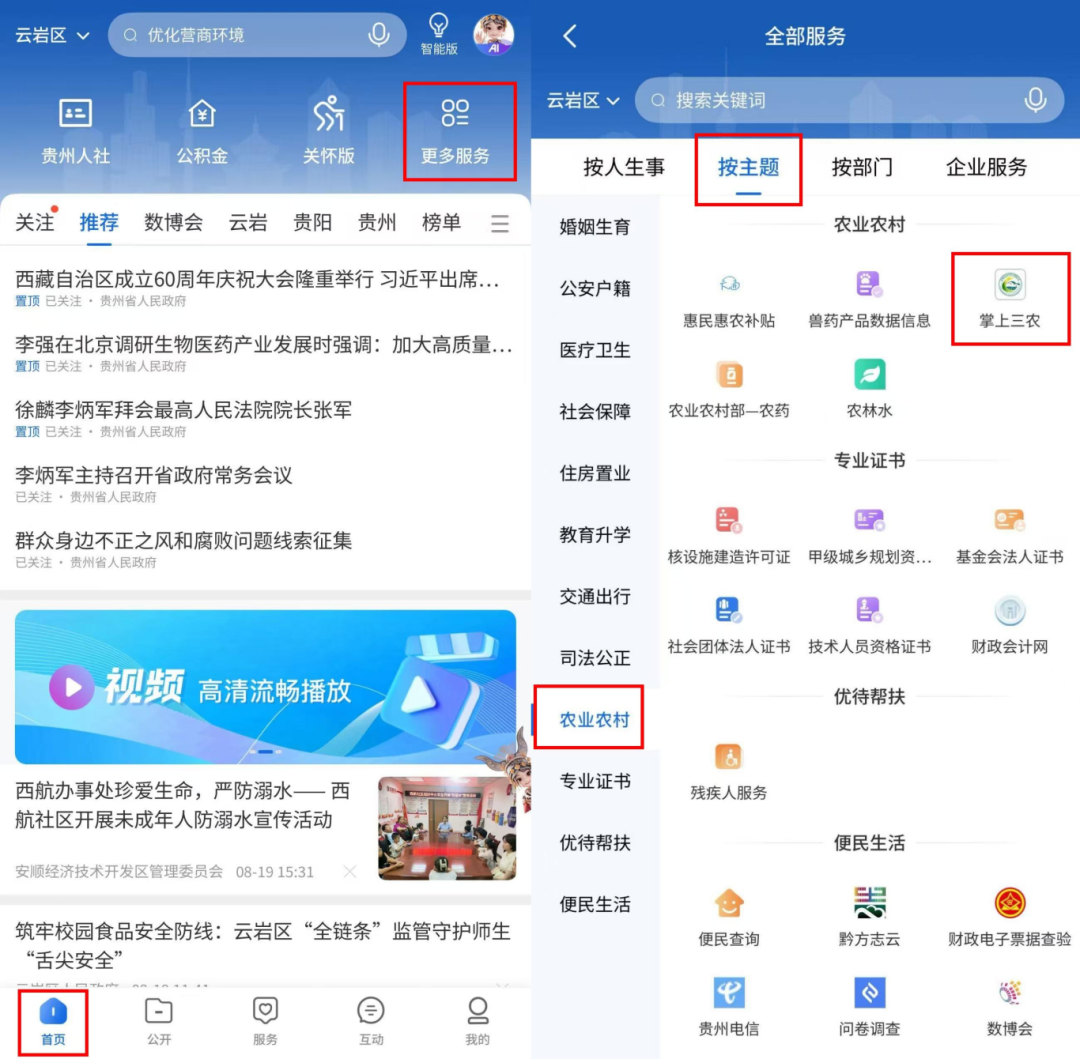 【方法一】登录“中国·贵州”移动端或微信小程序点击“首页”板块选择“更多服务”在“我的服务”第二页选择“掌上三农或选择“按主题”的“农业农村”栏点击“掌上三农”进入页面在“事项办理”板块点击“农村宅基